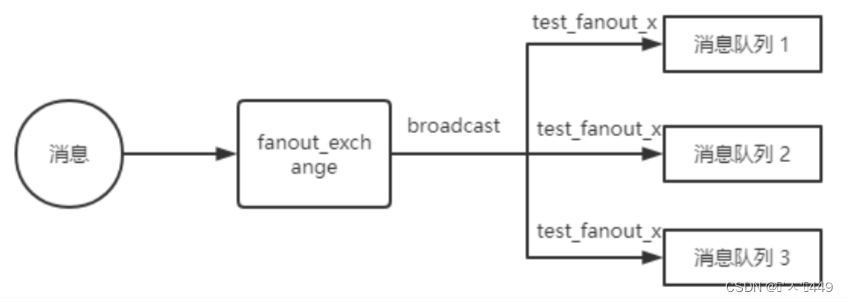 上图中,消息队列 1 、消息队列 2 、消息队列 3 这三个消息队列的名称均为 test_fanout_x ,且均与名为 fanout_exchange 的交换机进行了绑定,所以,消息在经 fanout_exchange 交换机之后,均会被传递到这三个队列中去。