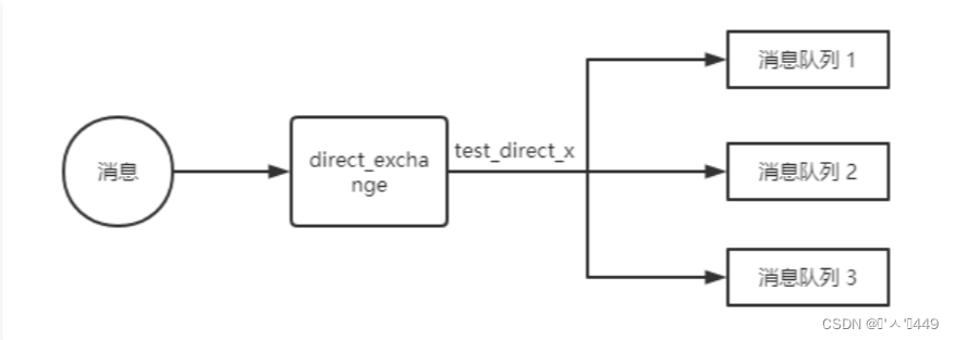 消息在经过 direct_exchange 交换机之后,会根据名为 test_direct_x 的 routing_key 与相应的消息队列进行匹配,如果消息队列 1 、消息队列 2 、消息队列 3 都与该 routing_key 相匹配,那么我们的消息会全部流转到这三个消息队列中去。