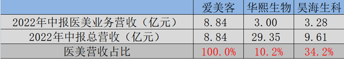 想要弄懂三家医药龙头公司的核心竞争力,必须通过统一业务维度进行观测。在2022年中报中,爱美客、华熙生物、昊海生科的医美业务营收分别为8.84亿元、3亿元和3.28亿元,爱美客的营收全部有医美业务贡献,而华熙生物真正属于医美业务的营收甚至比昊海生科还要低。