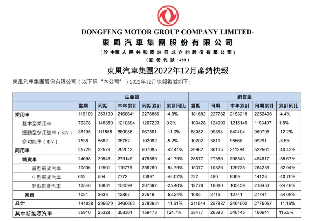 「探客出行」从东风汽车旗下子公司东风汽车集团股份(以下简称:东风集团)的2022年12月产销公告发现:东风集团在12月实现汽车总销售量约21.16万台,同比减少17.93%;2022年实现累计汽车总销售量约246.45万台,同比减少11.19%。