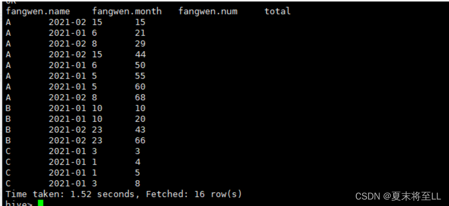 select * ,sum(num) over(partition by name order by month ROWS BETWEEN UNBOUNDED PRECEDING AND CURRENT ROW) total from fangwen;