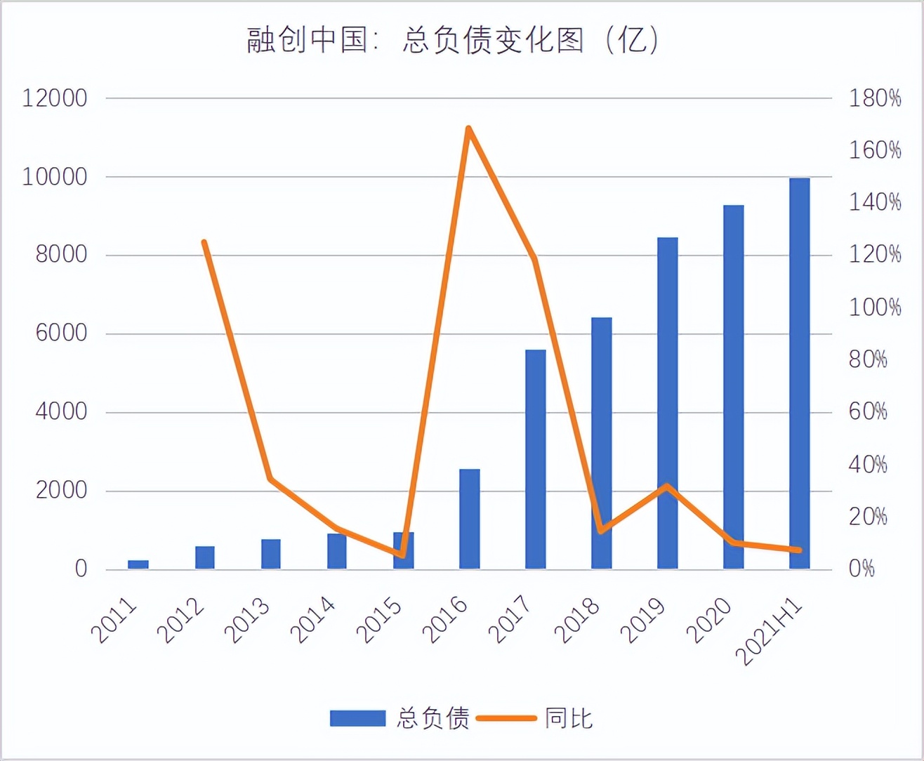 《正经社》分析师梳理发现,跟大幅拿地相对应的,是融创中国2016年的总负债规模也大幅增长,较前一年增长了168%,达到2578亿元。直到最新的2021年中报,总负债规模更是达到9971亿元。