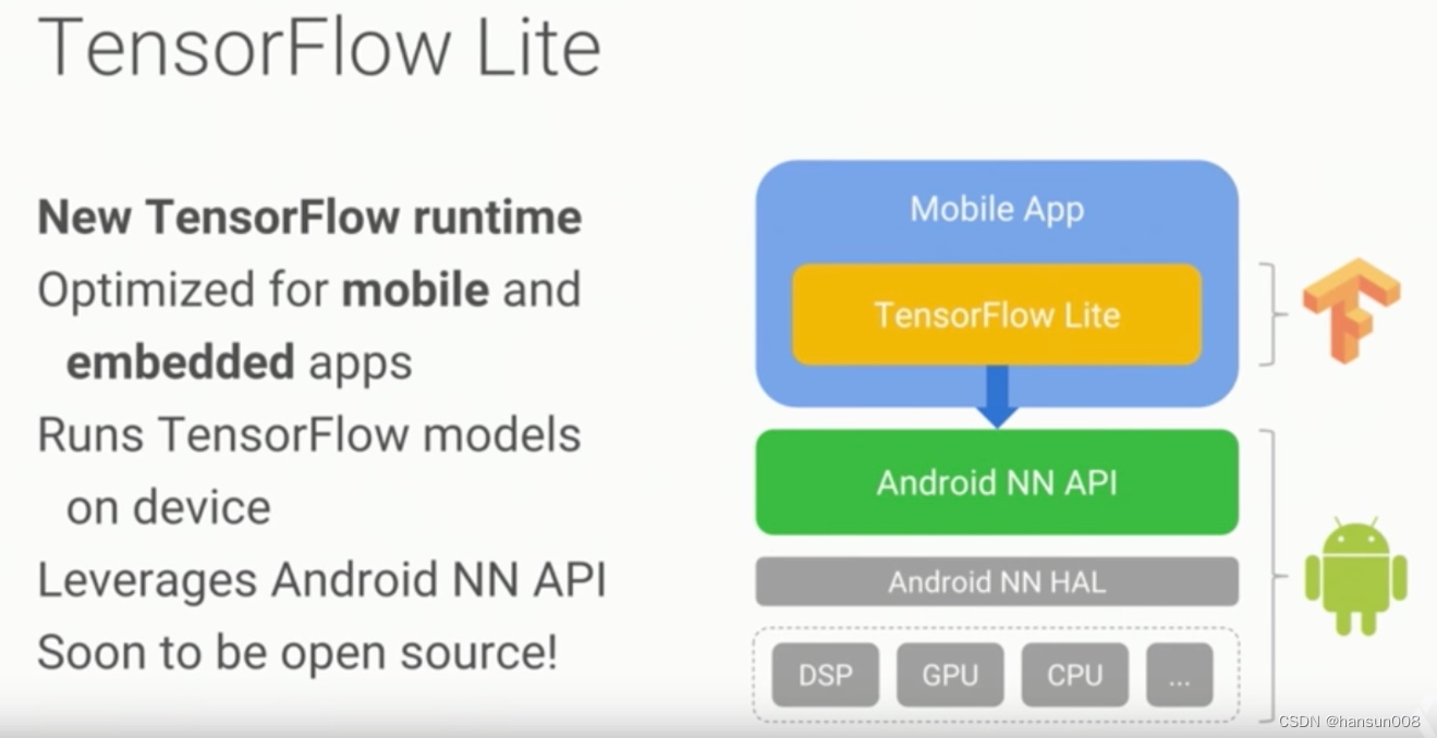 •2017 年 5 月,Google 在年度 I/O 大会上,宣布会推出 TensorFlow Lite,运行在下一代 Android 系统将会新增的 Neural Network API 之上,使得开发者可以将 TensorFlow 深度学习框架创建的模型移植到移动端运行。10 月 25 日,Google 发布了 Android 8.1 Beta 开发者预览版,正式推出了 NN API: