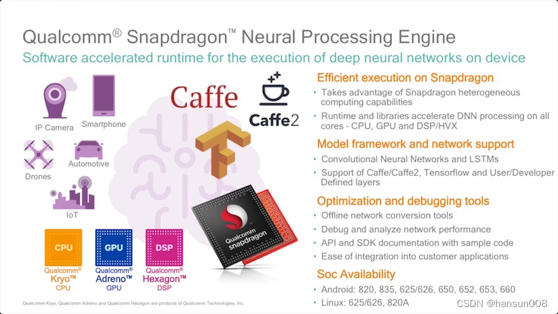 高通在 2017 年 12 月发布最新芯片骁龙 845 时提到:“In addition to the existing support for Google’s TensorFlow and Facebook’s Caffe/Caffe2 frameworks, the Snapdragon Neural Processing Engine (NPE) SDK now supports TensorFlow Lite and the new Open Neural Network Exchange (ONNX), making it easy for developers to use their framework of choice, including Caffe2, CNTK and MxNet. Snapdragon 845 also supports Google’s Android NN API.”