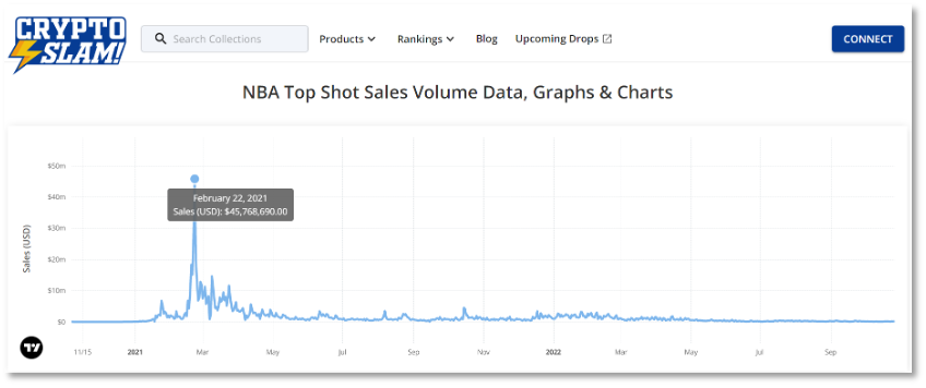 NBA Top Shot上线早期,交易金额时常霸占NFT市场的前5名。2021年2月,交易量登顶,日交易额达4000多万美元,2.24亿美元的月交易额曾让它在整个市场风头无两。
