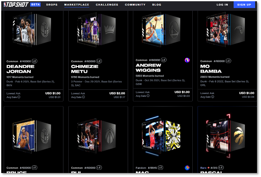 这个诞生于加密牛市早期的NFT项目原本自带光环,不仅拿到了NBA的官方授权,还曾获得NBA球星乔丹和杜兰特的投资,运营方Dapper Labs也是现象级链游CryptoKitties(加密猫)的创建者,算是鼻祖级的NFT产品开发方。