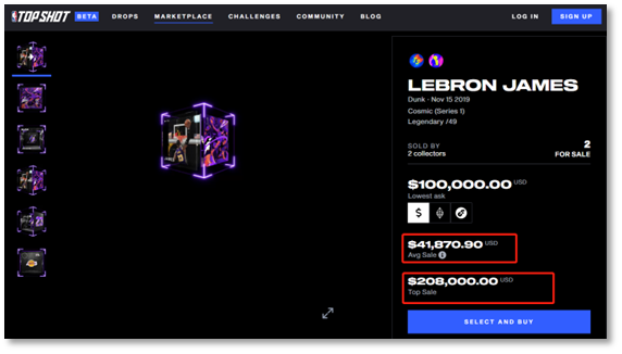 NBA Top Shot Moments(简称NBA Top Shot)是基于Flow公链推出的体育类数字收藏卡,市场常称之为“NBA球星卡NFT”,这些NFT球星卡记录着NBA球员在比赛中的精彩瞬间视频,比如詹姆斯的总决赛扣篮,科比的罚球等等,用户可以使用加密资产或信用卡购买,支持二级市场交易。该项目由Dapper Labs于2020年发起,获得了NBA的官方授权。