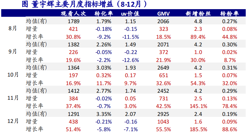 而且复盘2022年8-12月份东方甄选直播间的数据也不难看出,董宇辉对于东方甄选的观看次数、GMV的提升均有明显的带动作用。以去年12月为例,有董宇辉直播日观看人次均值、转粉率、GMV分别为1291万、0.19%、2925万。