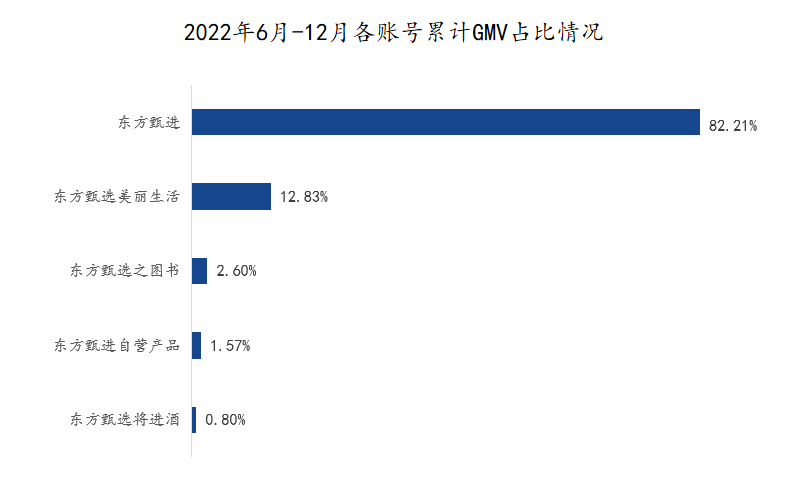 除了对供应链的依赖,东方甄选还过度依赖主号。从去年6-12月东方甄选各直播间营收占比来看,主号东方甄选依然是GMV的大头。导致这种情况出现的原因或和部分直播账号开播时间过短有关,但有些过于垂直的账号注定难以形成较高的GMV。