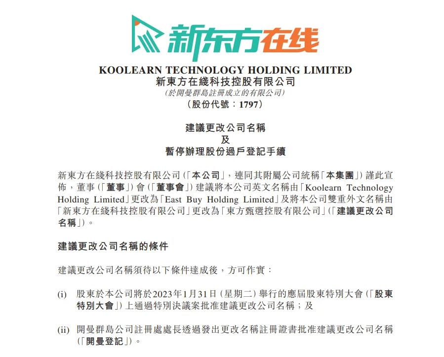 而为了完成全面转型,在2023年1月5日,新东方旗下的新东方在线发布公告称,董事会建议将本公司英文名称由Koolearn Technology Holding Limited更改为East Buy Holding Limited及将本公司双重外文名称由新东方在线科技控股有限公司更改为东方甄选控股有限公司。