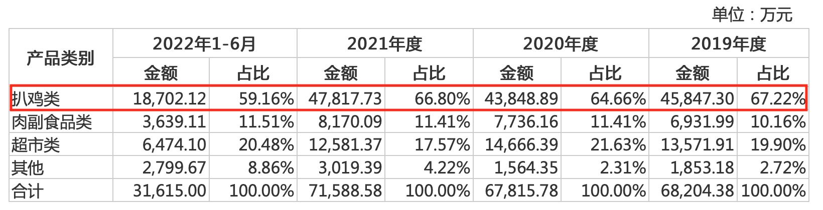 观察公司的产品结构,2019年至2022年1-6月,公司扒鸡类产品收入占主营业务的收入比例分别为67.22%、64.66%、66.8%和59.16%,占比较高且较为稳定。这也意味着公司一直以来对扒鸡类产品依赖度较高,并且还没有发掘出可以带动收入增长的第二曲线。
