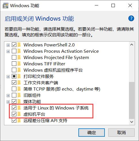打开系统虚拟机平台和WSL