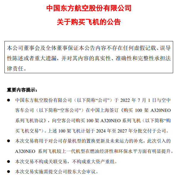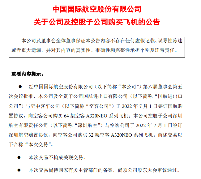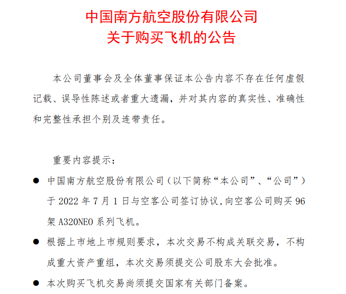 在航空业迈入复苏进程的同时,各航司还在布局未来市场。7月1日,三大航接连发布公告称,公司与空客公司签订协议,向空客公司购买A320NEO系列飞机。其中,国航与其子公司深航共购买96架,东航购买100架,南航购买96架。