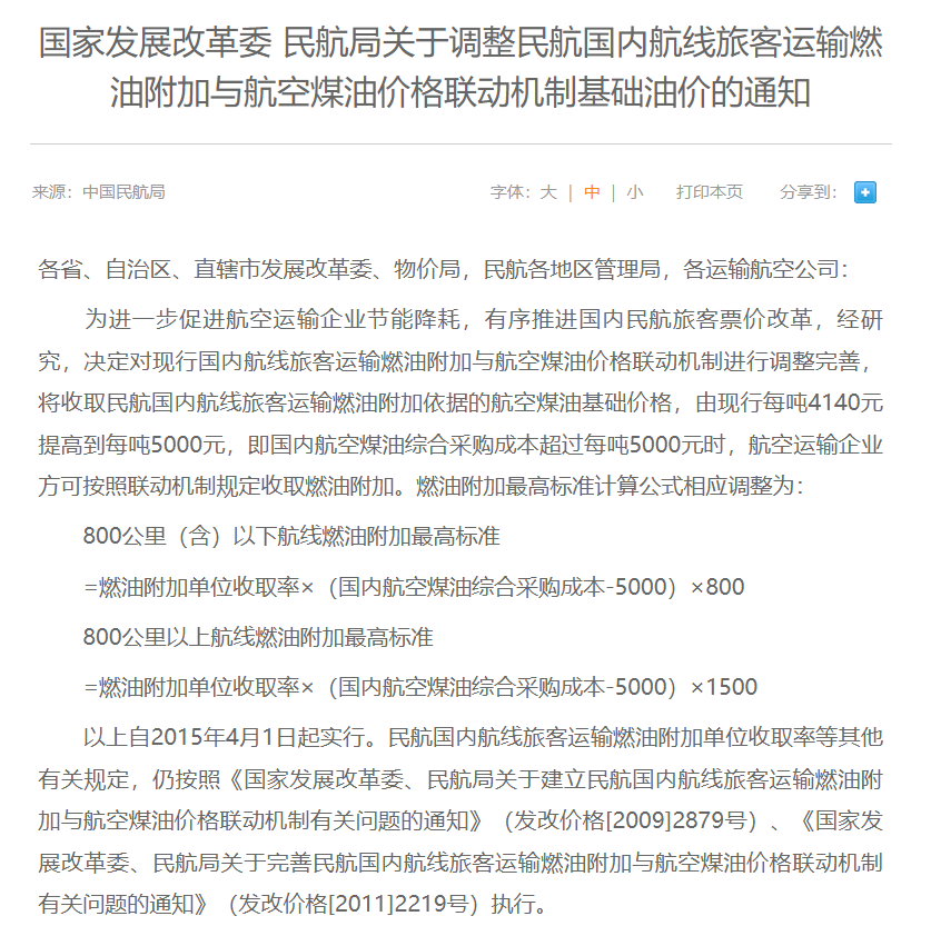 所谓燃油附加费指的是航空公司收取的反映燃料价格变化的附加费。根据民航局规定,国内航线旅客运输燃油附加采取与航空煤油价格联动的机制,由航空公司在规定范围内自主确定具体收取标准。